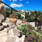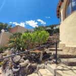 El exterior de la villa ha sido diseñado en distintos niveles, aprovechando la topografía de la parcela para crear un jardín con mucha personalidad. El terreno está distribuido en terrazas a diferentes alturas, con arbustos maduros y elementos de piedra natural que refuerzan el estilo tradicional mediterráneo de la propiedad.